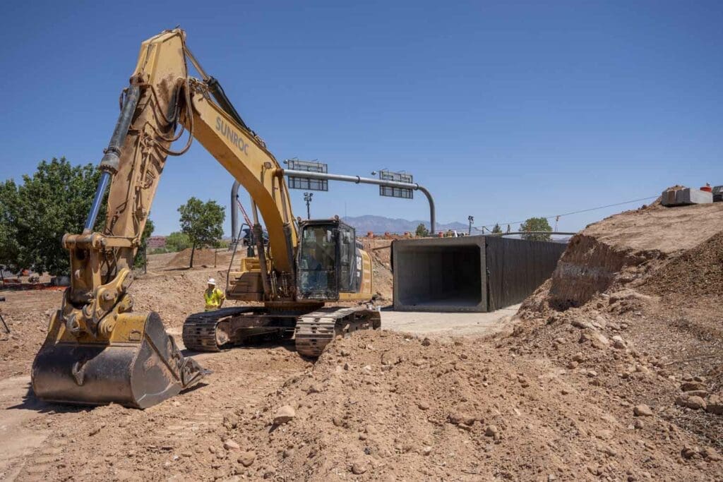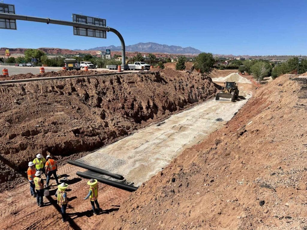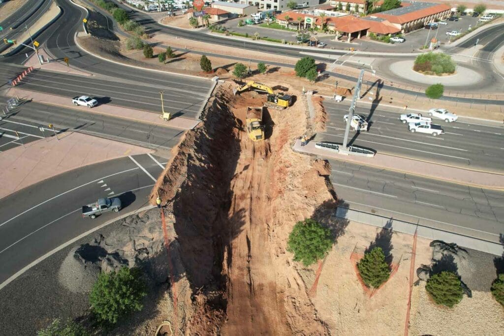 Creating a SR-18 pedestrian tunnel under Bluff Street in St. George, Utah, consisted of two phases. During Phase 1, Sunroc excavated and placed precast box culverts that were 18′ by 13′ with a total length of 188 feet to form a pedestrian tunnel under Bluff Street. Each concrete precast section weighed 56,000 pounds. This phase of the project had completion deadline of 15 days. Crews worked 24 hours a day 7 days a week, and completed the installation in 11 days, earning full incentive from UDOT. Crews excavated 6,500 cubic yards of material, placed the box culvert (along with waterproofing membrane, trench drain pipe, and conduits), backfilled 4,000 cubic yards of material, placed granular borrow, road base, concrete curb and gutter, median curb, concrete median filler, and asphalt paving.